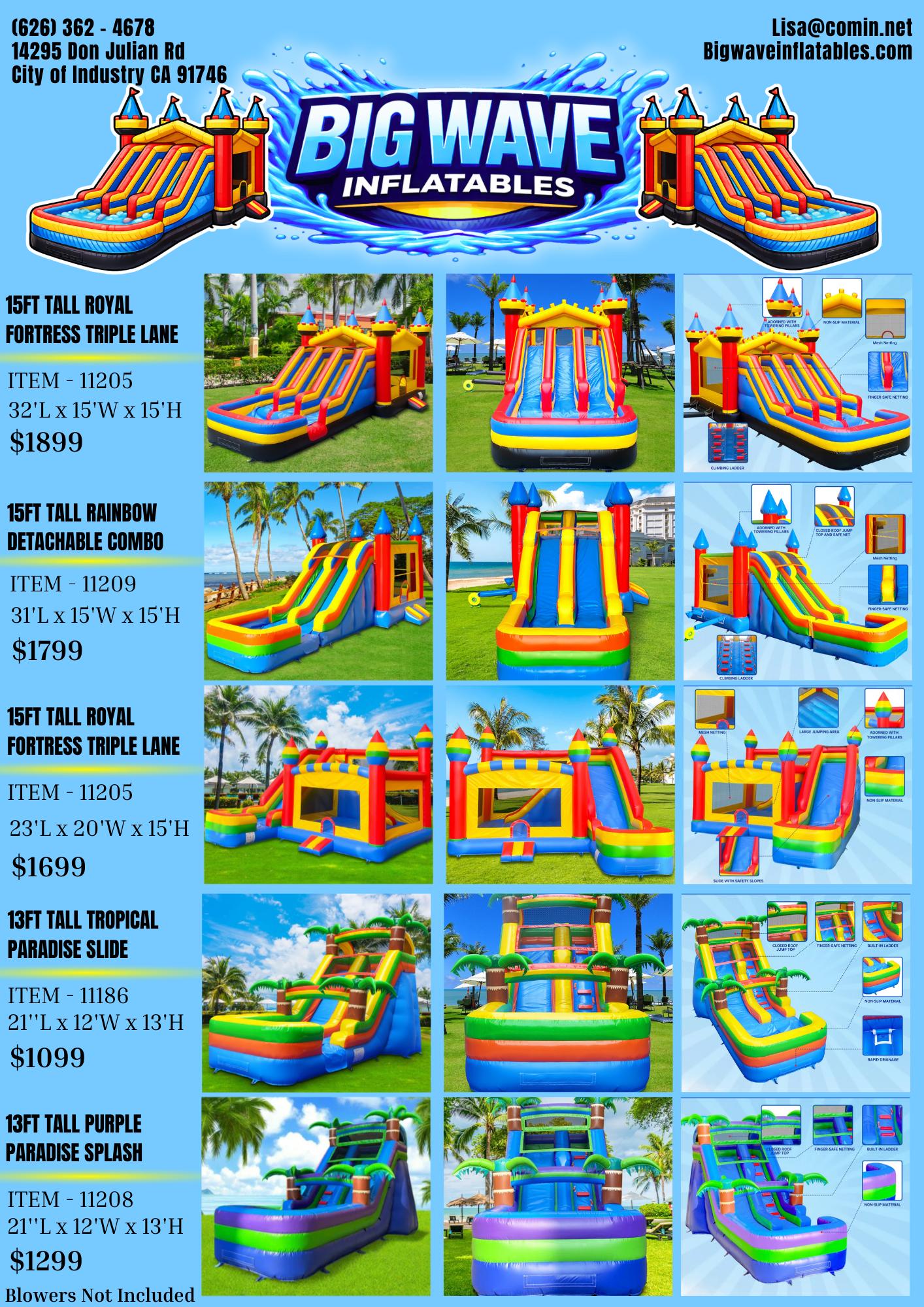 🌊 Big Wave Inflatables, formerly known as Coming Inflatables, offers commercial water slides and combo units made with durable 16oz Plato PVC commercial-grade material for strength, safety, and long-lasting performance. With inventory ready to ship from our California warehouse, we provide fast, reliable delivery for rental businesses ready to grow.